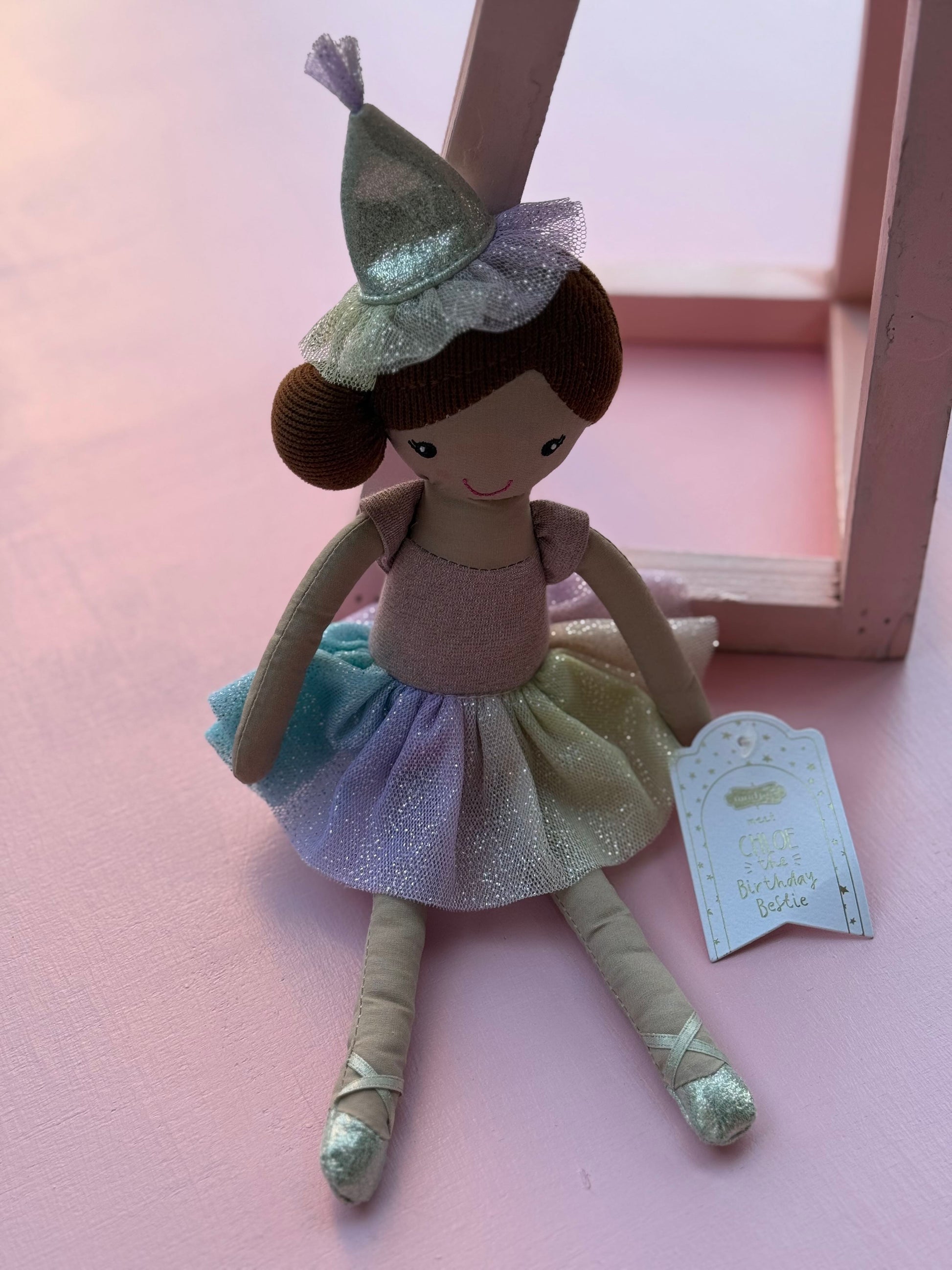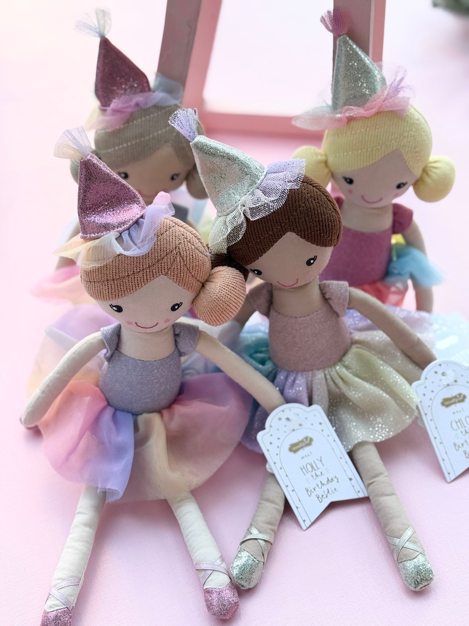 It’s party time, and your new bestie is ready to celebrate you! Meet the Birthday Besties—four cuddly, colorful dolls who can’t wait to join your birthday fun. Each one has her own style, personality, and party hat, so the only question is... which one will be your new BFF? There’s Chloe with her lovely brown hair, always ready for cake and giggles. Lily has soft sandy hair and loves throwing confetti. Holly’s bright orange hair matches her big birthday energy, and Dottie with her bouncy blonde hair is all about hugs and happy dances! Pick your perfect party pal and get ready for the best birthday ever! 1 Faux Linen Doll Dimensions: 11" 4 Style Options: Chloe, Lily, Holly or Dottie