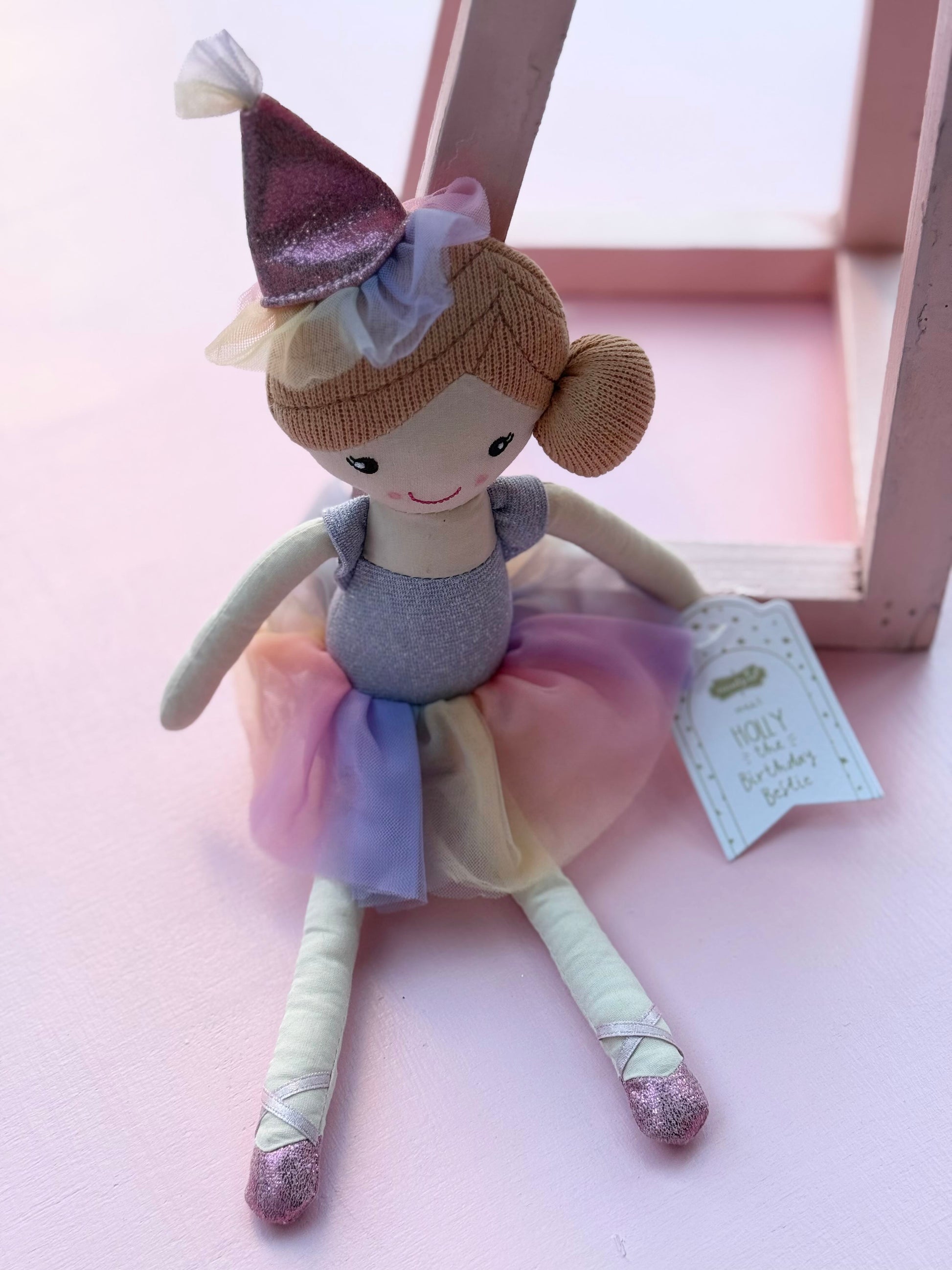 It’s party time, and your new bestie is ready to celebrate you! Meet the Birthday Besties—four cuddly, colorful dolls who can’t wait to join your birthday fun. Each one has her own style, personality, and party hat, so the only question is... which one will be your new BFF? There’s Chloe with her lovely brown hair, always ready for cake and giggles. Lily has soft sandy hair and loves throwing confetti. Holly’s bright orange hair matches her big birthday energy, and Dottie with her bouncy blonde hair is all about hugs and happy dances! Pick your perfect party pal and get ready for the best birthday ever! 1 Faux Linen Doll Dimensions: 11" 4 Style Options: Chloe, Lily, Holly or Dottie