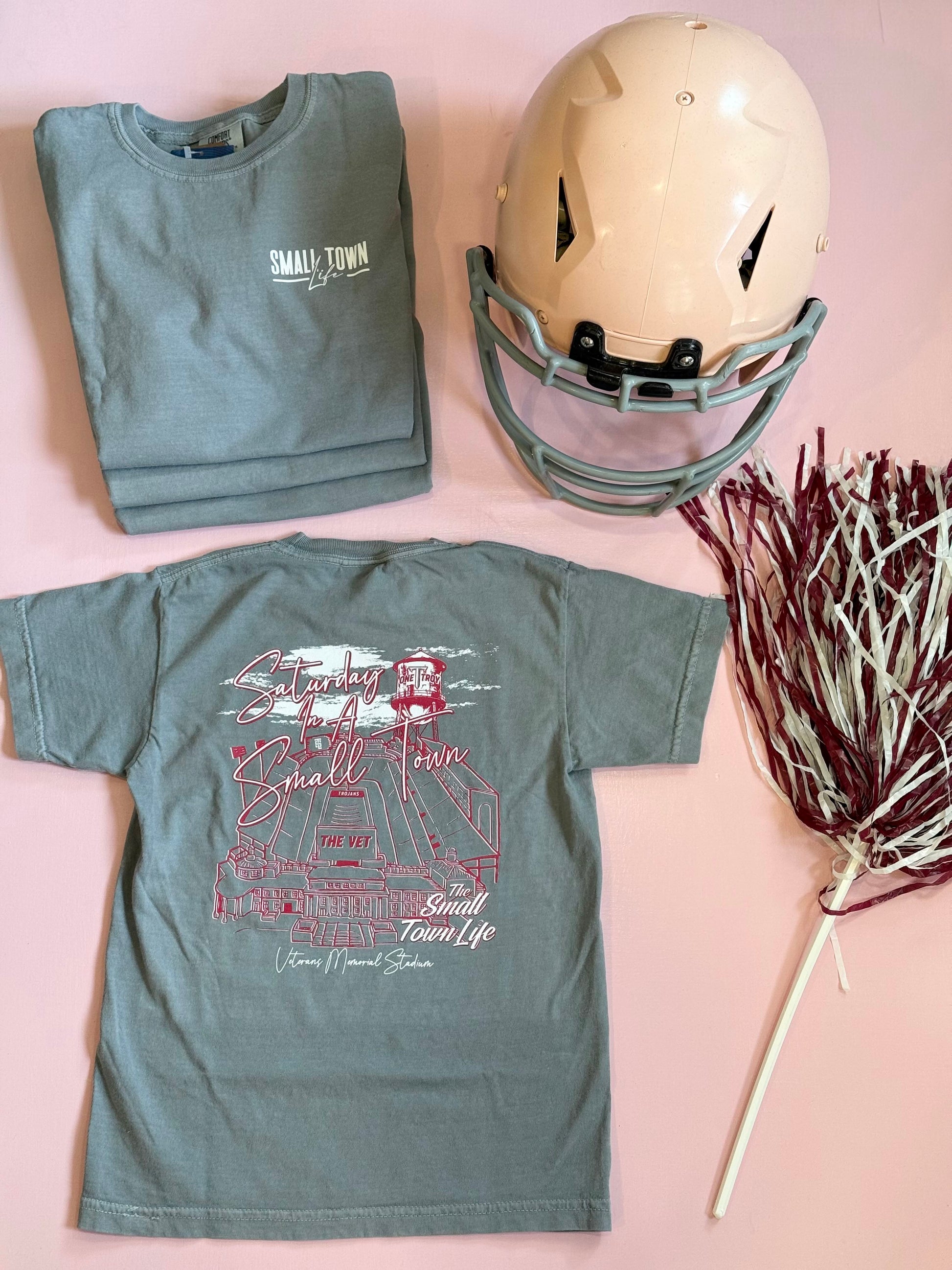 The Small Town Life tee featuring the best place to be in Troy, AL on a Saturday, None other than Veterans Memorial Stadium.
