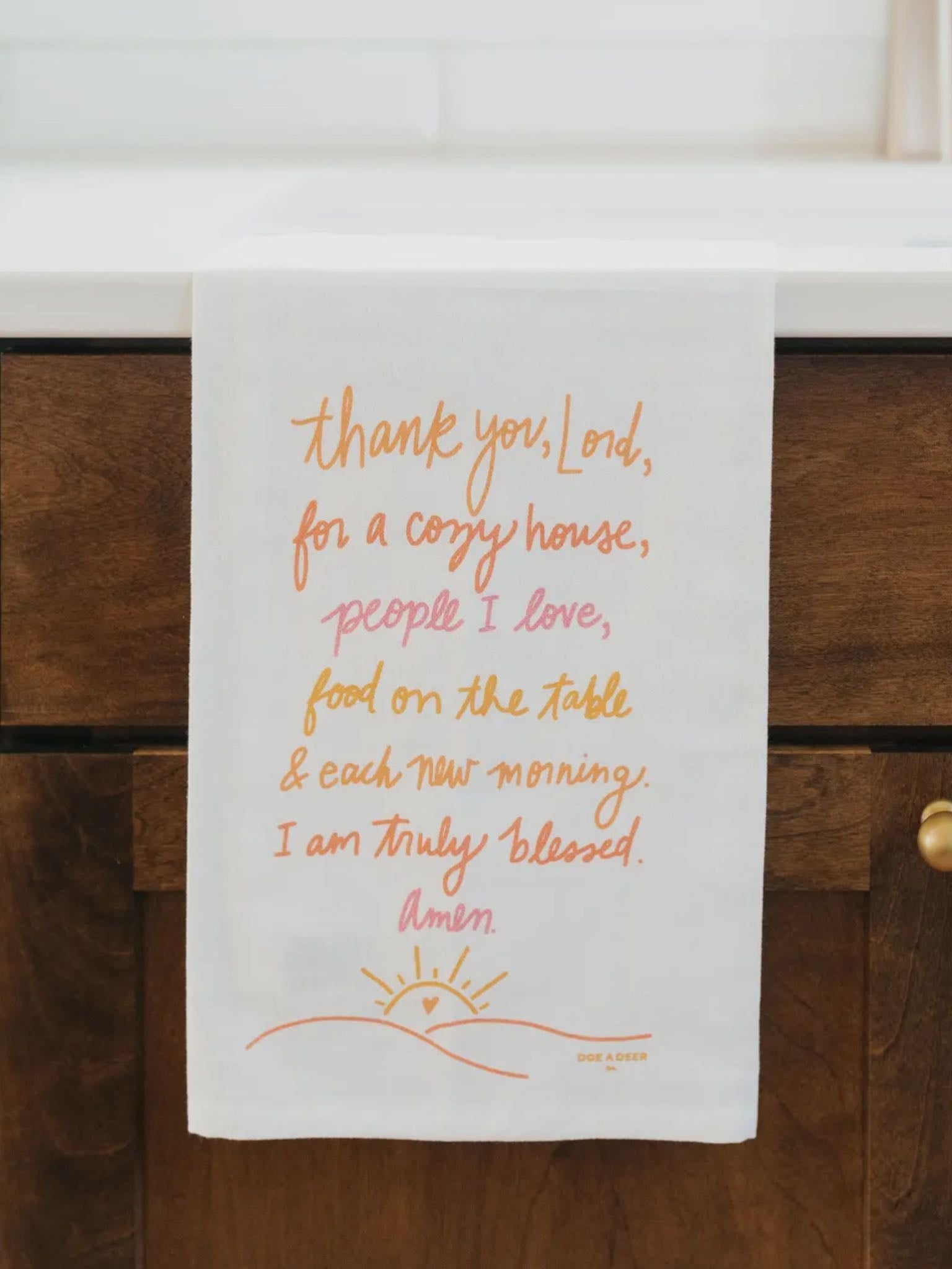 Hang this in your kitchen for a constant reminder that you have so much to thank the Lord for! Qualities that make flour sack towels special: 28 x 29 inches of absorbent (and adorably designed) flour sack cotton Digitally printed with water-based inks Please note that since the fabric of these towels is stretchy & soft, not every towel will be the exact same size or a perfect square, and that’s the beauty of American-made flour sack cotton! Comes folded and packaged with a belly band, prepared to add a warm touch to your kitchen