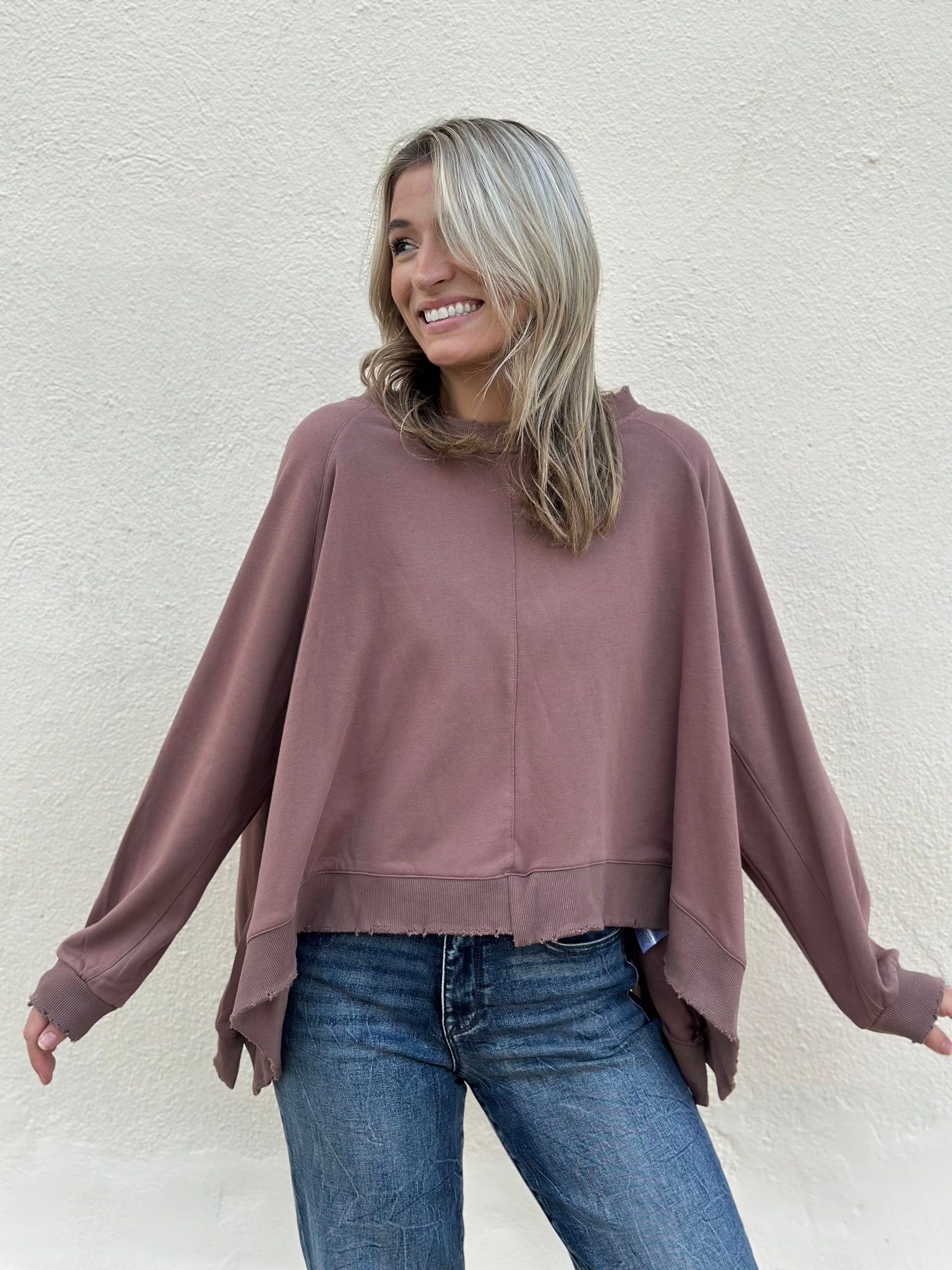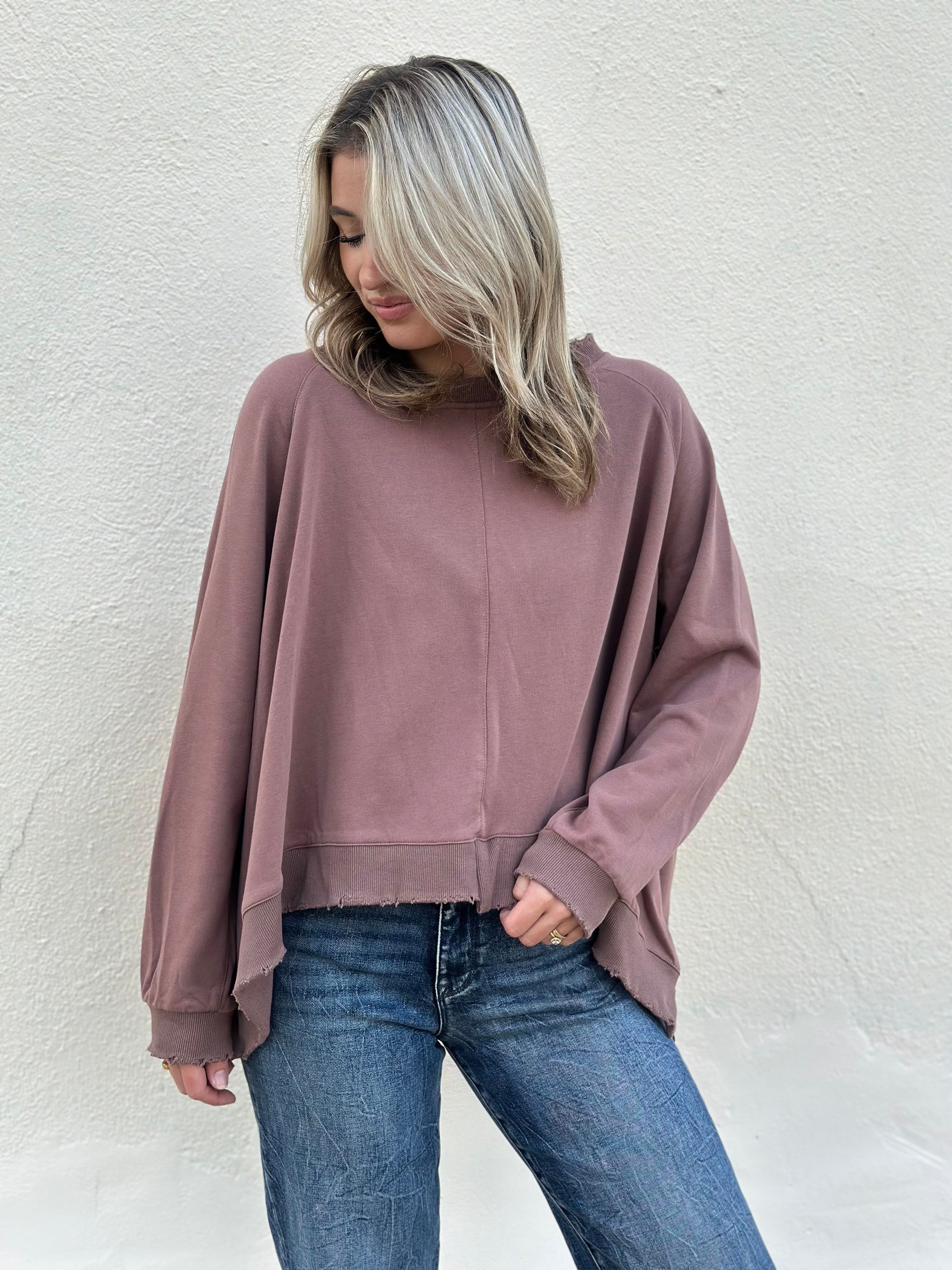 Distressed rib long sleeve oversized sweatshirt. Also available in pine.