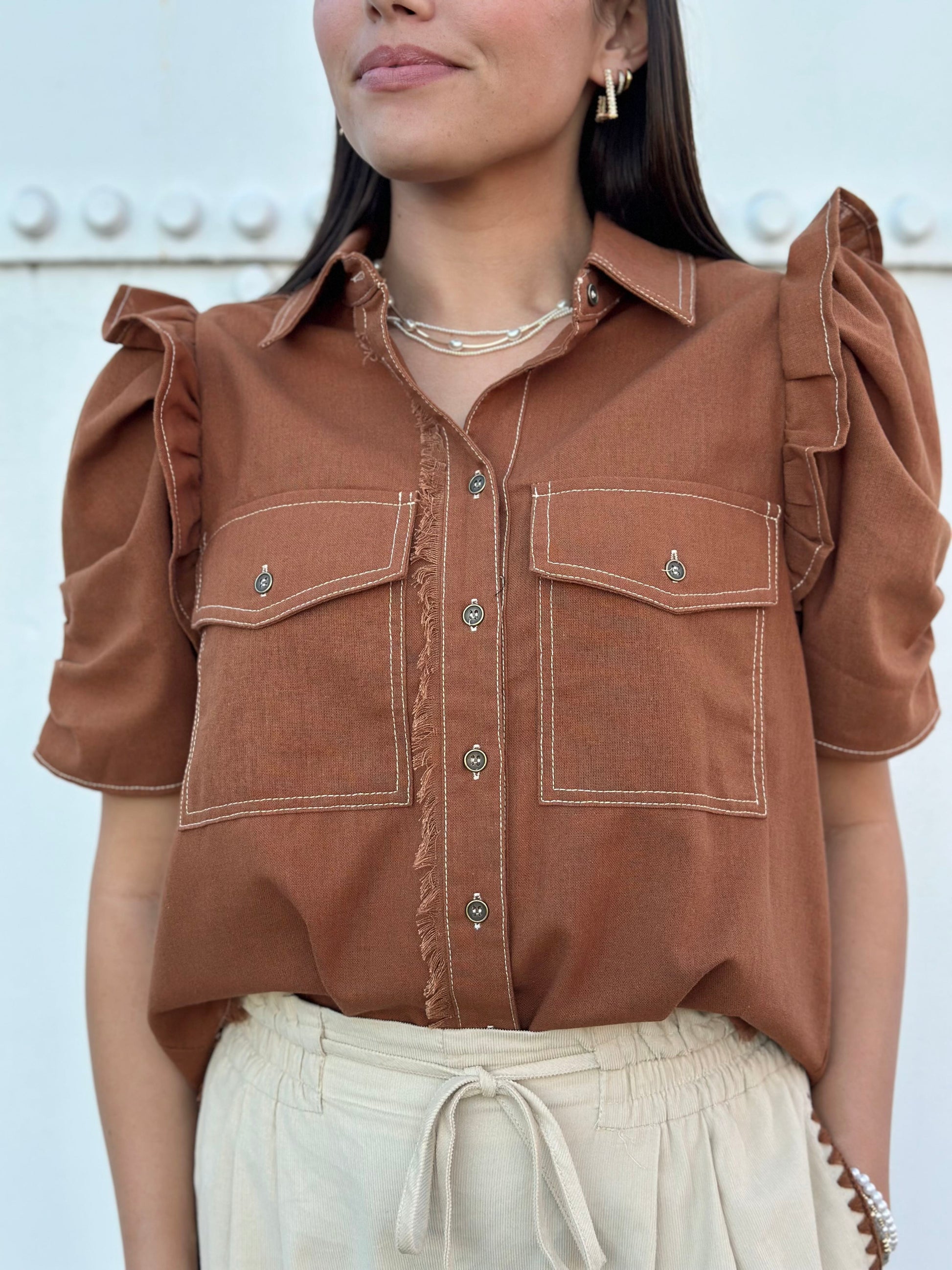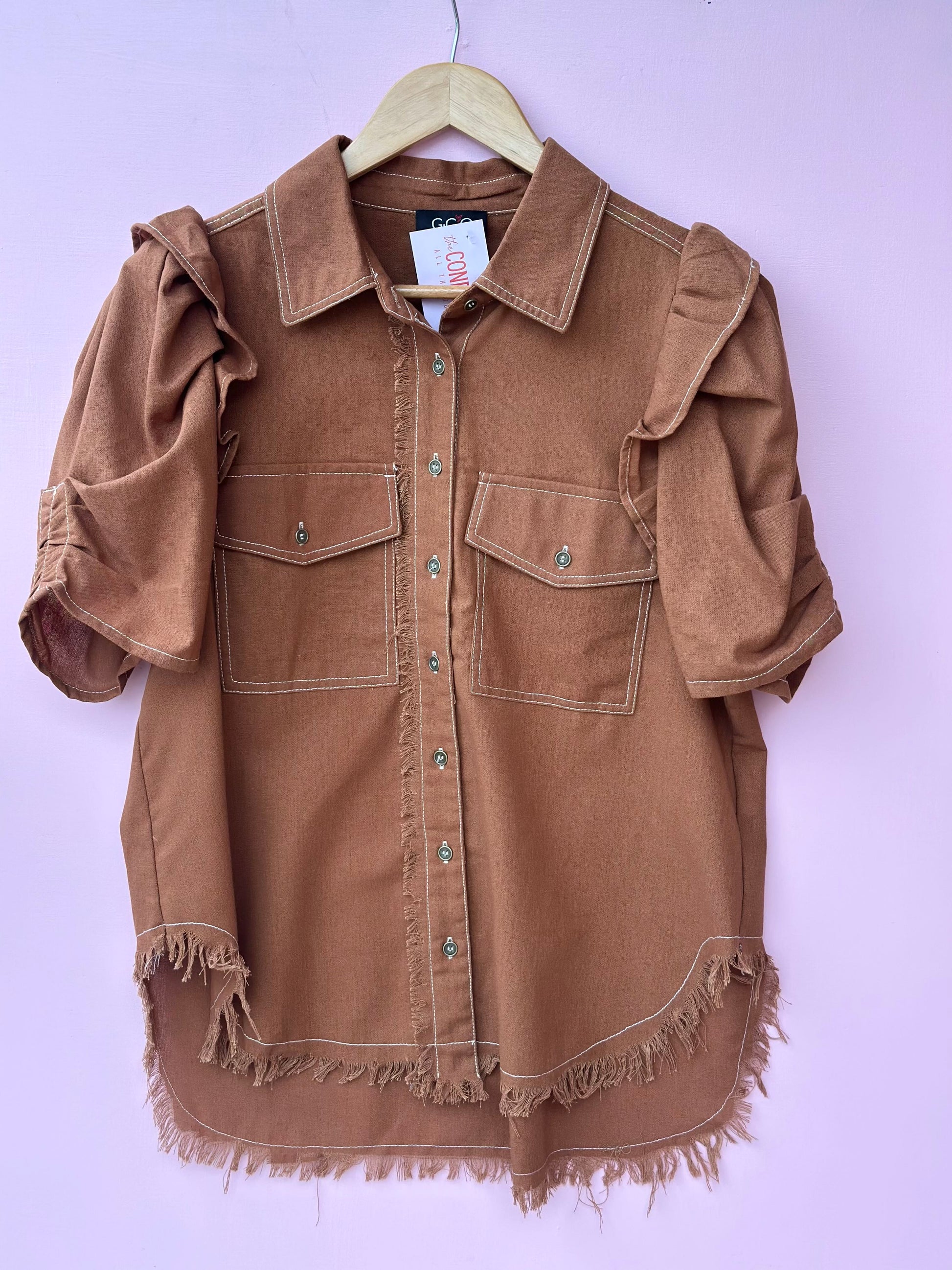 linen button up shirt with a ruffled gathered sleeve and frayed hem details