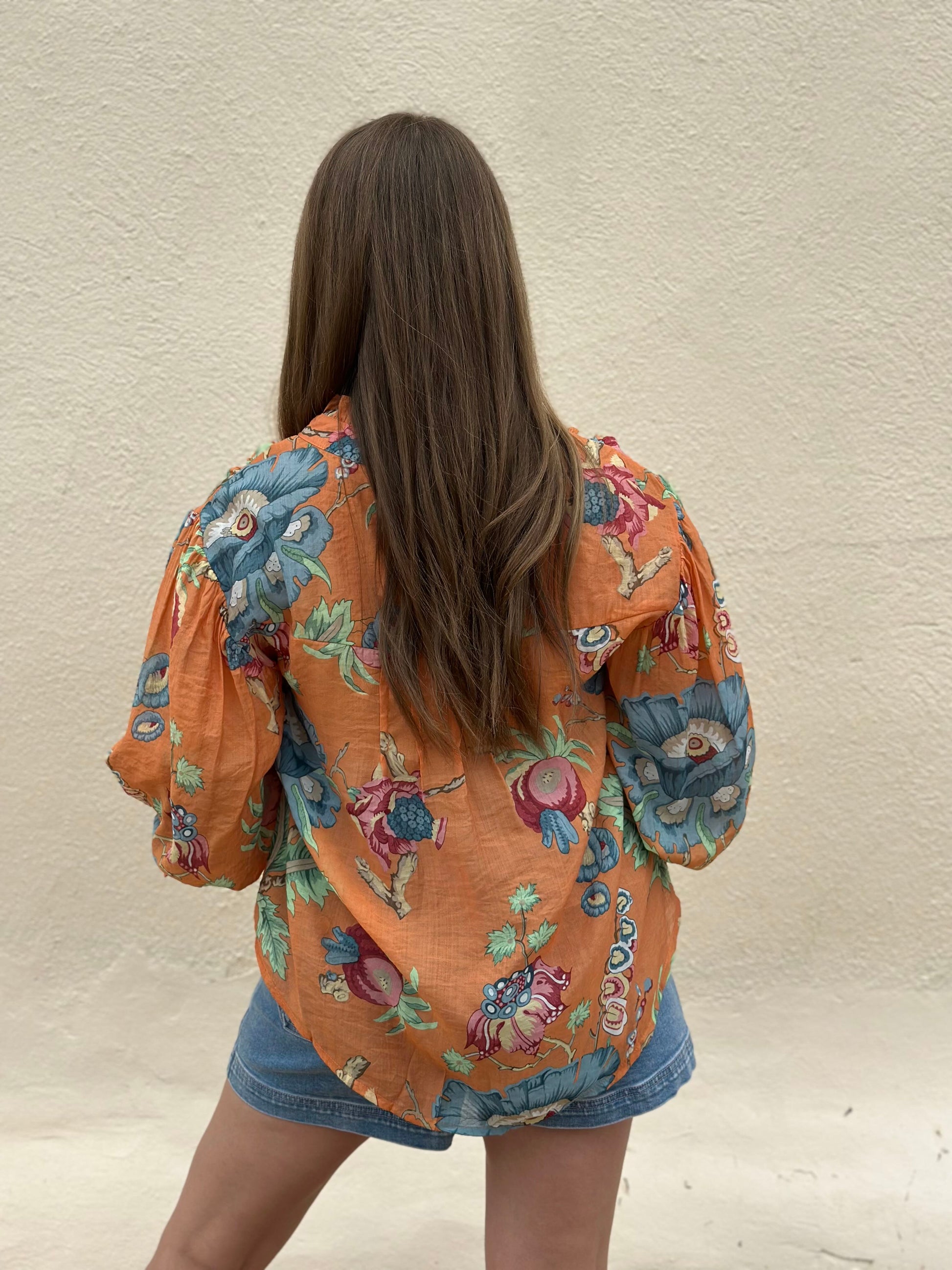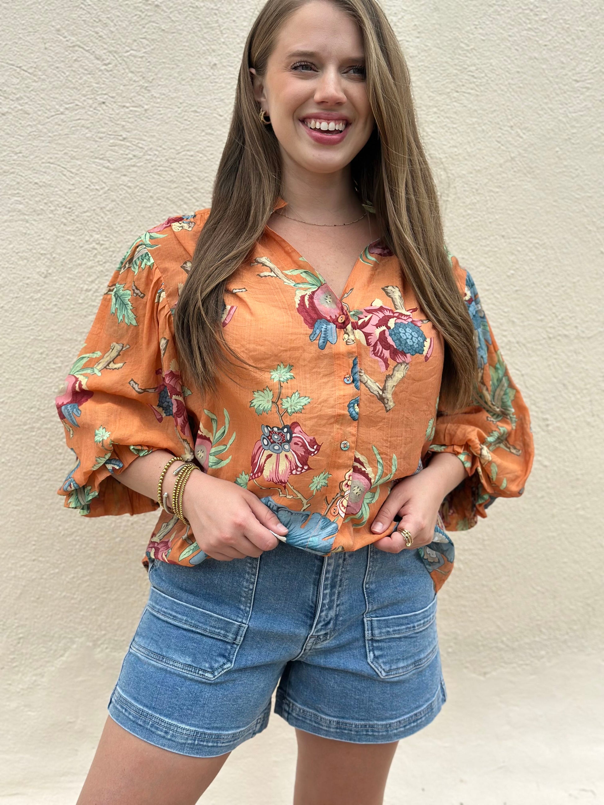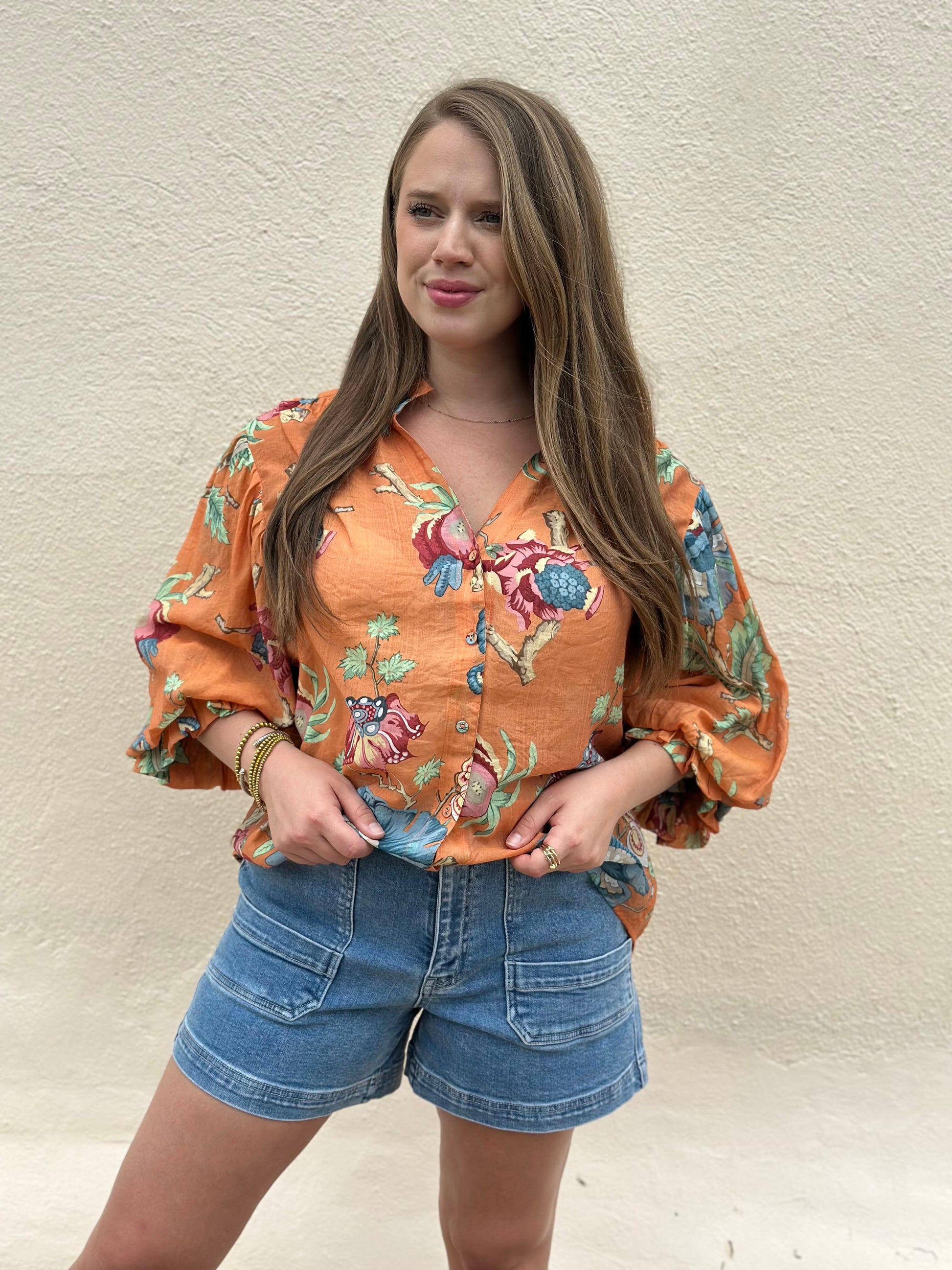 printed button down top with 3/4 gathered balloon sleeves