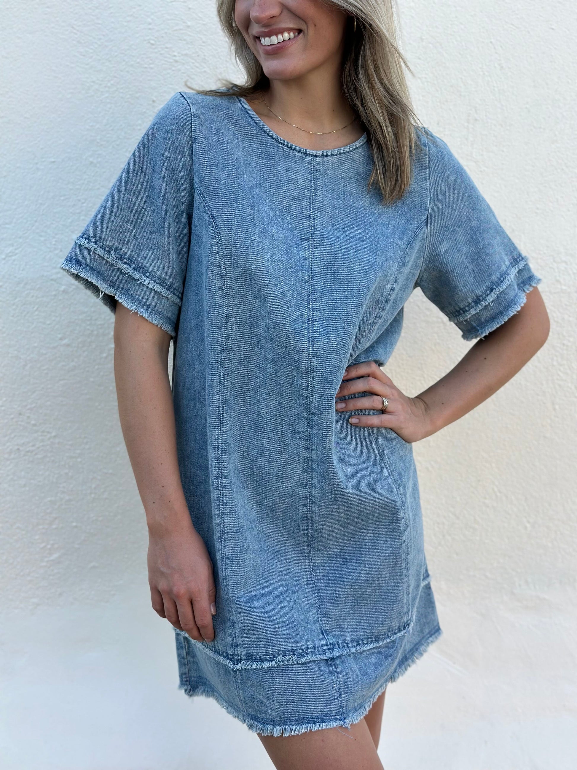 washed denim shift dress- round neck, short sleeve, key hole back, and frayed hem.