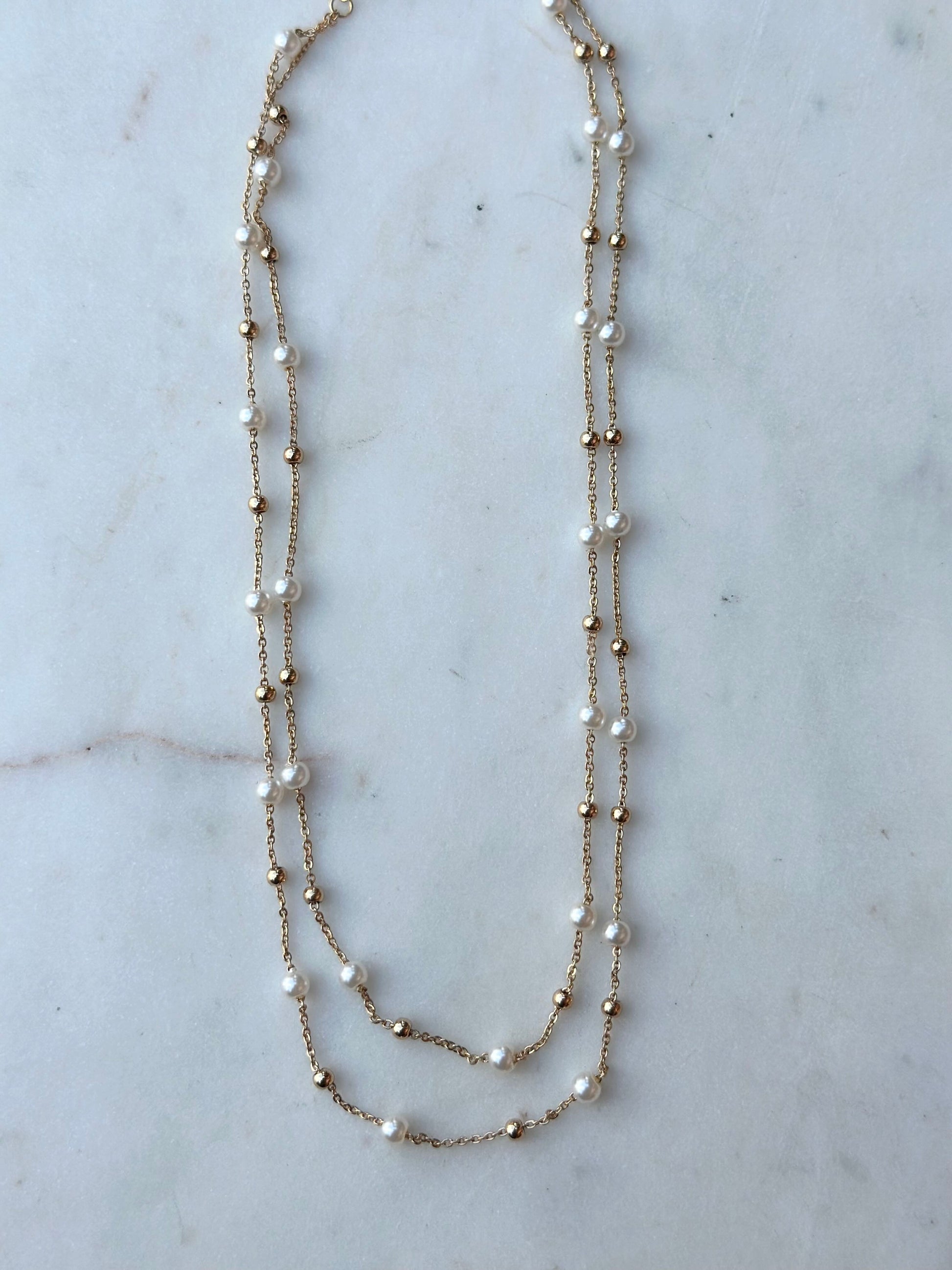 two layer chains with single clasp on a dainty gold and pearl necklace
